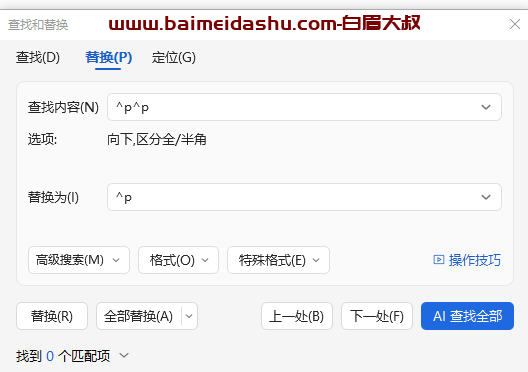2. 在查找内容中输入:`^p^p`(表示两个段落标记)