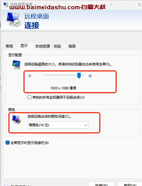 您的位置 首页 linux 运维 rdp -Windows远程桌面连接操作卡顿延迟的处理办法 白眉大叔 发布于 2025年10月26日 评论关闭 阅读(11) 改变后,声音暂停 后再播放,提高了一些。 如下图所示: 1,点击远程桌面连接----显示选项----显示。 2,将像素调节到合适的大小,将颜色修改为增强色(16位)。 3,重新连接,卡顿延迟问题解决。 欢迎来撩 : 汇总all