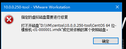 打不开磁盘“D:\VM\centos\10.0.0.250-tool\CentOS 64 位-模板机-cl1-000001.vmdk”或它所依赖的某个快照磁盘。