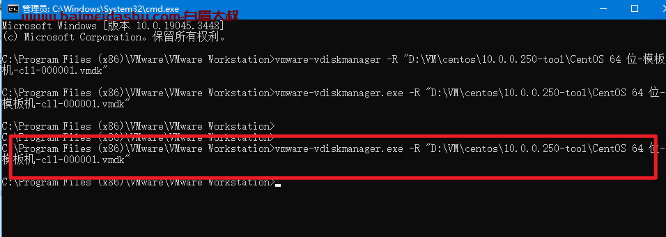 vmware-vdiskmanager.exe -R "D:\VM\centos\10.0.0.250-tool\CentOS 64 位-模板机-cl1-000001.vmdk"