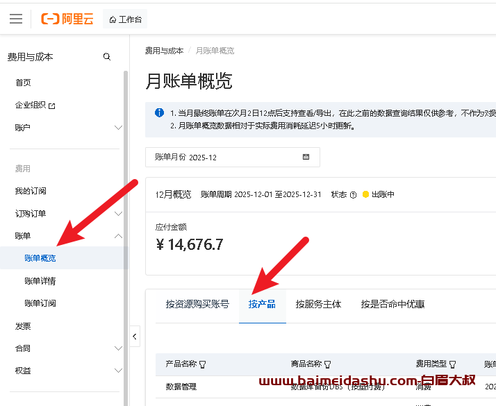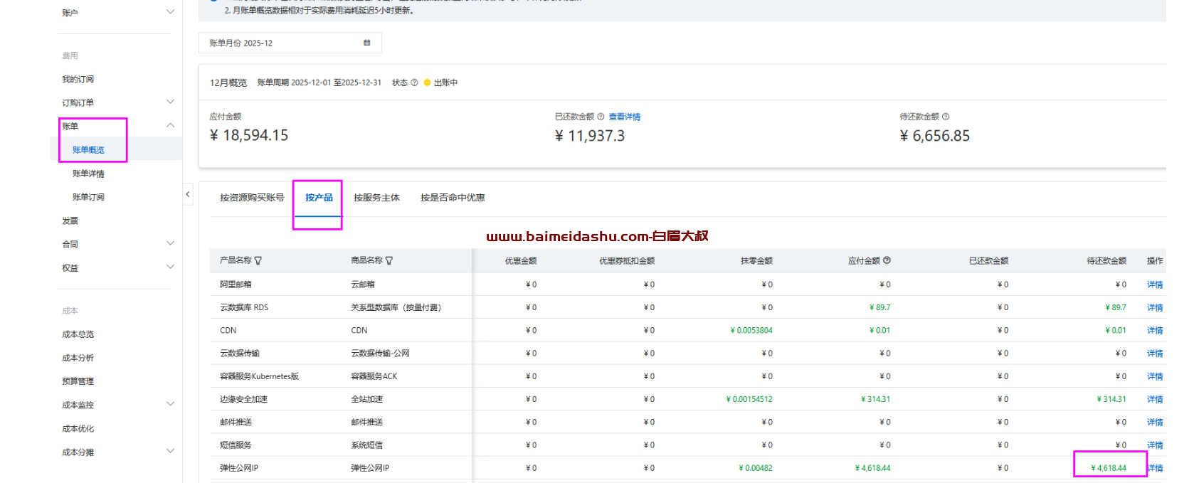 您的位置 首页 linux 运维 阿里云账单详情- 白眉大叔 发布于 2025年12月19日 评论关闭 阅读(23) 阿里云账单详情- 连接 账单-》 账单概况 -》 按产品: 欢迎来撩 : 汇总all