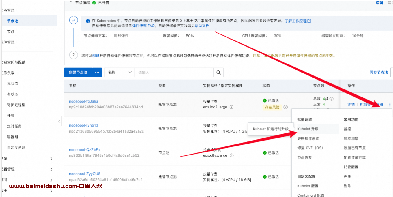您的位置 首页 阿里云 阿里云-kubelet 升级 白眉大叔 发布于 2026年1月13日 评论关闭 阅读(12) 您好,kubelet 升级,参考截图位置,建议业务低谷操作升级 如果节点上有重要的数据,建议升级前做好磁盘快照 欢迎来撩 : 汇总all